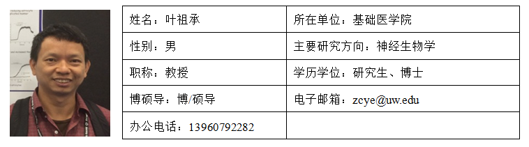 叶祖承,男,1970年1月生,无党派,北京大学学士, 美国阿拉巴马大学神经生物学博士,曾任华盛顿大学(西雅图)博士后、助理教授。2011年入选福建省“闽江学者”并任自慰A片 教授、博士生导师, 2018年全职回国工作。长期从事神经生物学科研工作,尤其是神经胶质细胞方面的研究。主要研究领域为神经胶质细胞与神经胶质瘤细胞的神经递质转运与代谢、离子通道与缝隙蛋白半通道的功能与特性、能量代谢与调控、以及神经胶质细胞在情感与认知中的作用。常任《Journal of Neuroscience》, 《Glia》,《Journal of Neurochemistry》等杂志审稿人。研究项目先后获“美国NIH 基金” “国家自然科学基金”等的资助。研究成果取得美国授权专利两项,在《Cancer Research》、《Journal of Neuroscience》、《Glia》等学术期刊及国际会议上发表学术论文40余篇,在胶质瘤谷氨酸释放与缝隙蛋白半通道领域做出过开创性研究成果,相关论文SCI他引两千余次,单篇引用500余次。