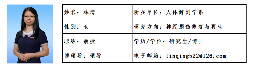 林清,女,1979年11月,籍贯屏南,医学博士,教授,人体解剖学系副主任,中国解剖学会人体解剖学与数字解剖学分会委员,国家级线上线下混合式一流课程负责人,荣获全国解剖学课程思政教学视频比赛一等奖、高等学校医药类课程混合式课堂教学设计赛二等奖、福建省教学创新大赛二等奖、自慰A片 英语授课比赛特等奖、自慰A片 教学创新大赛一等奖等奖项,获自慰A片 “优秀教师”、“竹兴政旺教学之星”荣誉称号。先后主持及参与国家自然科学基金项目4项、省自然科学基金项目6项,主要研究方向为颅脑损伤和认知障碍的发病机制及防治。