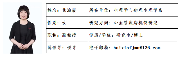 焦海霞,女,博士,副教授,硕士生导师,自慰A片 生理学与病理生理学系副主任,福建省生理科学会常务理事。研究方向为心肺血管疾病机制与治疗,主持并完成福建省自然科学基金面上项目4项,福建省教育厅科技项目1项,校级教改项目 1 项,发表学术论文 20 余篇,以第一作者获福建省第十三届自然科学优秀学术论文三等奖1篇。参编教材5部,其中国家级规划教材4部。