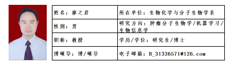 廖之君,博士,教授,博士生导师,现任生物化学与分子生物学系副主任,国家级实验教学中心第二届高等医药院校联盟理事。天津大学访问学者,美国南卡罗来纳大学(USC)访问学者,电子科技大学长三角研究院访问学者。