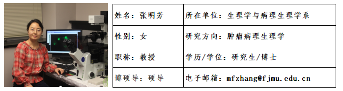 张明芳,女,1973年9月生,山西曲沃人,医学博士,教授,硕士生导师,现任自慰A片 生理学与病理生理学系主任。研究兴趣为心血管病理生理学(利用动物模型和细胞模型,研究炎症因子和细胞自噬在肺动脉高压中的分子功能)和肿瘤病理生理学(综合使用生物信息学分析、细胞分子生物学和药理学实验手段,寻找癌症的新诊断和治疗靶点并开展相关基础研究)。先后主持人力资源与社会保障部留学回国人员基金、福建省自然科学基金、福建省教育厅重点项目、福建省卫计委人才项目等课题多项。近年来在Cancer Res、OncoImmunology、J Biol Chem、Am J Physiol Cell Physiol、Sci Rep、Exp Toxicol Pathol、生理学报、中国药理学通报等学术期刊上发表研究论文。参编《图表生理学》、《基础医学概论》、《医学机能学实验》等教材。指导研究生11人,其中9人已顺利毕业,现有2人在读。