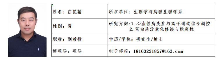 庄昆翰(Kun-Han Chuang),男,1979年7月生,理学博士,副教授,硕士生导师。2013年于台湾阳明大学医学院获得生理学专业理学博士学位。2014年至2018年期间,曾在美国佛罗里达州立大学、杰克森实验室和美国国立卫生研究院担任博士后研究员。2021年至2022年赴美国乔治华盛顿大学作为访问学者。2022年取得美国临床病理学会(ASCP)分子生物学技术认证。目前的研究重点为:(1) 探索心血管病炎症微环境与血管平滑肌细胞内离子信号之间的调控机制,寻找潜在药物靶点;(2) 研究Hedgehog信号通路核心分子的泛素化修饰及其蛋白质降解机制。至今共发表学术论文15篇,其中以第一作者或通讯作者身份发表7篇,在SCI收录期刊中发表13篇,包括Cell Reports、Elife、Hypertension、JCI Insight等一区期刊。主持过多项省部级和校级科研项目,并担任Journal of Pharmaceutics & Drug Delivery Research、OncoTargets and Therapy、Frontiers in Nutrition、Frontiers in Immunology、Bioinformatics and Biology Insights等多本国际期刊的审稿人及编委。已指导3名研究生及4名本科生。热忱欢迎对学术研究有兴趣的同学加入团队。