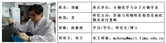 郑敏,男,1982年7月出生,籍贯福州,博士学位,副教授,发展规划办主任,担任福建省抗癌协会第七届青年理事会常务理事、福建省生物化学与分子生物学学会理事;获福建省青年科技奖,入选福建省青年拔尖人才,获国家基金、福建省杰出青年基金,福建省自然科学基金重点项目,福建省高校杰出青年科研人才培育计划资助。主要从事肝癌与药物性肝损伤发病机制及诊疗策略研究,围绕ATF4-ATF3通路,探讨细胞应激反应在肝癌与药物性肝损伤的作用及其潜在的临床意义。分别于2006年和2012年赴美国Scripps研究所和哈佛医学院从事一年的访问交流。在Nature Cell Biology, Cell Research, Cancer Letters等杂志上发表第一作者或通讯作者SCI论文十余篇。近三年,培养的硕士研究生有三名研究生以第一作者或共同第一作者发表论文各一篇,并赴厦门大学攻读博士学位;联合培养的一名博士研究生以第一作者身份在Cancer Letters杂志上发表研究性论文,并赴中科院深圳先进技术研究院从事博士后研究。