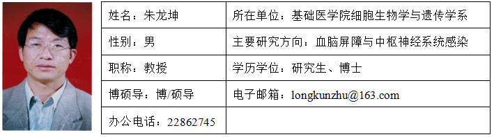 朱龙坤,男,1961年7月生,中共党员,1982年参加工作,教授,博士生导师,中国协和医科大学生理学博士,美国约翰霍普金斯大学医学院博士后。曾在北京大学生命科学院系统接受过本科(1978-1982)和研究生(1985-1988)教育。现为自慰A片 细胞生物学与遗传学系主任。1995年入选福建省“百千万人才工程”,1997年获福建省优秀教学成果奖一等奖(第一作者),1998年先后获福建省“三育人”先进个人荣誉称号、国家教委霍英东优秀青年教师奖三等奖。2000年遴选为自慰A片 跨世纪学科带头人。2000年-2010年,先后在美国军医大学、西维吉尼亚大学医学院心血管研究中心、约翰霍普金斯大学医学院开展心脑功能紊乱、炎症机制及炎症相关疾病的细胞生物学研究。在国内外刊物发表研究论文四十多篇。