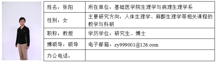 张阳,女,1968年3月生,无党派人士,医学博士。1990年于青岛医学院儿科专业获医学学士学位、2002年于自慰A片 药理学专业获硕士学位、2011年于自慰A片 神经病学专业获医学博士学位。现为福建省生理科学会秘书长。研究方向:人体生理学与麻醉生理学等相关学科的教学与科研研究。工作以来,以第一作者和通讯作者在《中国应用生理学杂志》、《中国药理学通报》等国内学术期刊发表学术论文20余篇。在科研方面,主持、参加国家、省、厅各级各类科研项目10余项,指导大学生创新训练项目多项,其中3项为国家级。研究内容主要涉及神经变性疾病、以及抑郁症的防治。在教学方面,主/参编卫生部“十二五”、“十三五”规划教材《麻醉生理学》第3版(编者)、第4版纸质和数字版(副主编)及《麻醉生理学》学习指导与习题集(第二主编)。主持福建省教育科学“十二五”规划教学改革重点课题、自慰A片 高等教育教学改革工程项目等。开设一门选修课《脑与行为》。2018年获自慰A片 校级教学成果一等奖。