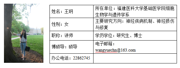 王玥,女,博士,硕士生导师。毕业于美国宾夕法尼亚州立大学, 获分子细胞综合生物学(Molecular, Cellular and Integrative Biosciences)专业博士学位。2018年引进人才,校高层次人才。于自慰A片 细胞生物学与遗传学系担任讲师,专任教师,从事教学与科研工作,重点在神经退行性疾病机制、神经损伤与修复相关领域进行深入的专门研究。