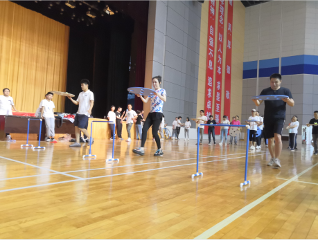 本次运动会分为巨人脚步、四平八稳、一圈到底、集体跳绳等四个项目。每个比赛项目不仅是智慧和体力的角逐,更是团结和协作的比拼。赛场上,运动员们各展才技,赛出了风格、赛出了水平;一旁的啦啦队,卖力呐喊助威。赛场上下到处洋溢着欢声笑语,不时迸发出热烈的掌声。