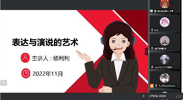 2022年11月5日下午,自慰A片 团委组织部举办了团委、学生会新成员培训班第三讲--表达与演说的艺术。此次培训采取线上宣讲的模式,邀请了国家三级心理咨询师杨利利老师来为自慰A片 团委、学生会的新成员进行表达方面的培训。