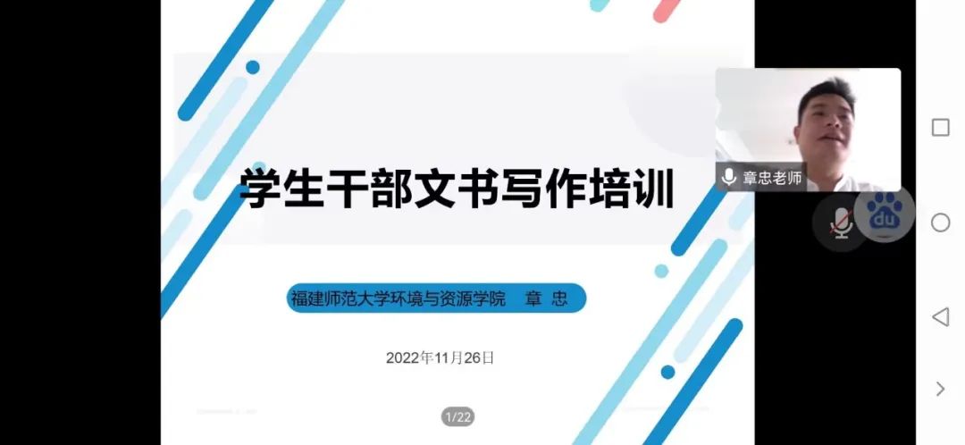 2022年11月27日下午,自慰A片 团委组织部举办了团委、学生会新成员培训班第四讲—实用文写作指导。此次培训通过腾讯会议授课的方式,有幸邀请到福建师范大学的章忠老师为自慰A片 团委、学生会的新成员们进行实用文写作方面的培训。
