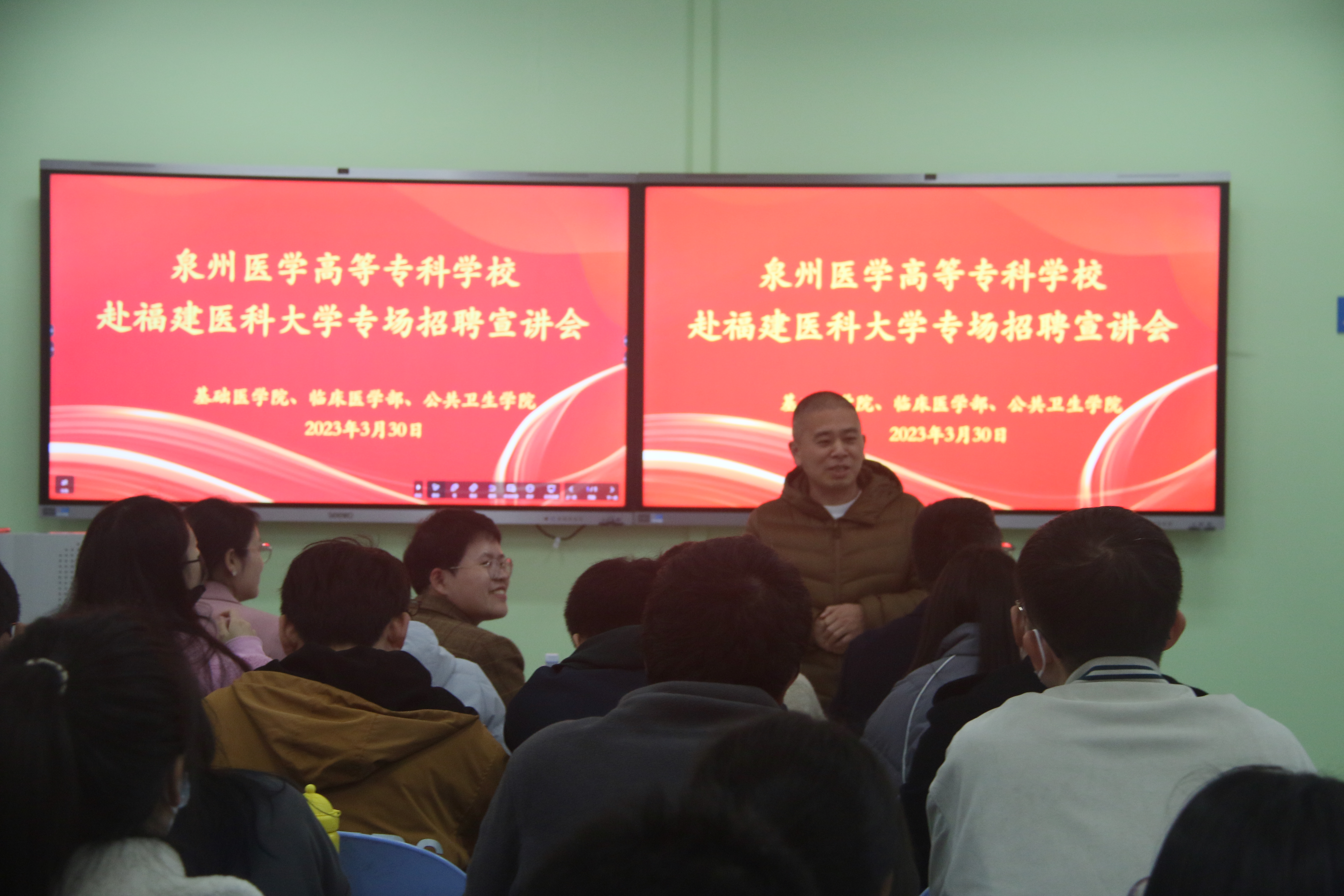2023年3月30日下午,自慰A片联合临床医学部、公共卫生学院在旗山校区第69教室,邀请泉州医学高等专科学校等单位来校进行校园宣讲和现场招聘。校学生工作处副处长曾银花、自慰A片 党委书记郭松斌、院长陈婉南参加。