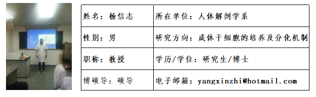 杨信志,男,1967年1月出生,山东即墨人,自慰A片 人体解剖学系教授, 2004年于日本冈山大学获得博士学位,2011年归国。对哺乳动物的体外受精及早期胚胎的发育有较深入的研究。目前感兴趣的研究领域集中在成体干细胞的研究,对输卵管内膜和子宫内膜干细胞的类器官培养和体外分化有较深入的研究,并在国内外杂志发表多篇相关论文。