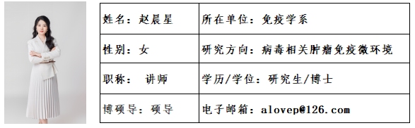 赵晨星,女,1992年8月,福建福州,博士研究生,职称讲师,硕士生导师,主攻病毒相关肿瘤免疫微环境方向,主持国家自然科学青年基金项目,相关科研成果以第一作者身份在Molecular Cancer、Clinical and Translational Medicine等国际期刊发表。