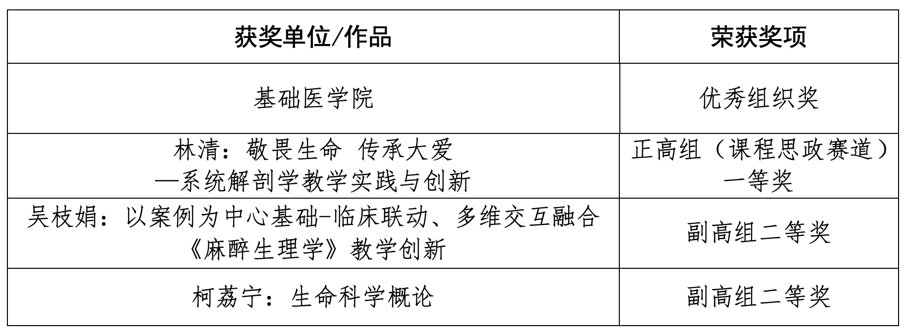 前期经各学系教师报名参赛,学院组织专家选拔和指导,推荐5名教师参加本次校赛。学校组织校外专家组网络评审,综合课堂教学实录视频、课程教学创新成果报告成绩之和总排名,自慰A片共有3位教师进入校赛现场评审环节。经过激烈角逐,自慰A片人体解剖学系林清教授获正高组(课程思政赛道)一等奖,生理学与病理生理学系吴枝娟副教授、人体解剖学系柯荔宁副教授获副高组二等奖,学院荣获优秀组织奖。