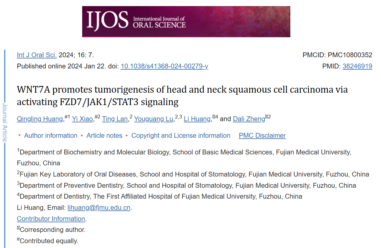 2024年1月22日,自慰A片 生物化学与分子生物学系黄清玲副教授以第一作者在International Journal of Oral Science杂志(中科院JCR一区,IF=14.9)在线发表题为WNT7A promotes tumorigenesis of head and neck squamous cell carcinoma via activating FZD7/JAK1/STAT3 signaling”的研究论文,该研究首次揭示了在头颈部鳞癌中高表达的WNT7A可以通过激活FZD7/JAK1/STAT3非经典Wnt信号通路在头颈部鳞癌的发生发展过程中发挥重要作用,有望为头颈部鳞癌的精准治疗提供新的靶标。