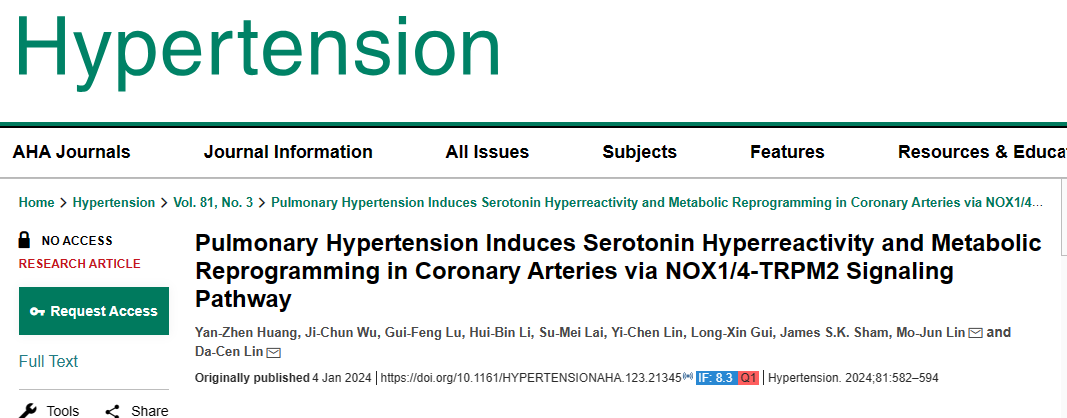2024年1月4日,自慰A片 生理与病理生理学系博士研究生黄燕珍以第一作者在Hypertension杂志(中科院JCR一区,IF=8.3)在线发表题为“Pulmonary Hypertension Induces Serotonin Hyperreactivity and Metabolic Reprogramming in Coronary Arteries via NOX1/4-TRPM2 Signaling Pathway” 的研究论文,该研究首次揭示了肺动脉高压(PH)通过激活NOX1/4-TRPM2信号通路介导细胞ROS-Ca2+信号紊乱,引发右冠状动脉5-羟色胺高反应性、冠状动脉平滑肌细胞代谢重编程和线粒体功能障碍。该研究为PH影响冠状动脉疾病提供了证据,并为PH 患者预防冠状动脉疾病提供了理论参考。