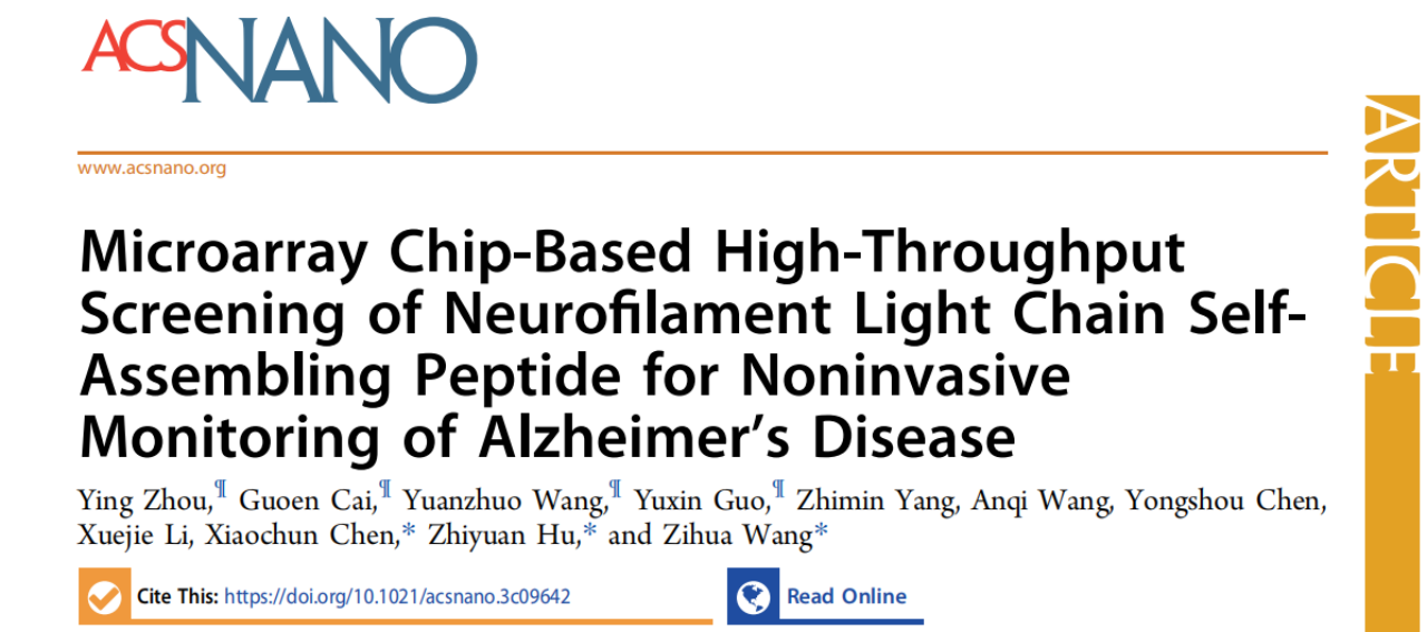 2024年6月28日,自慰A片 王子华副研究员、胡志远教授团队、自慰A片 附属协和医院陈晓春教授团队合作在材料学顶级期刊《ACS Nano》(中科院1区TOP期刊、影响因子15.8)在线发表了题为“Microarray Chip-Based High-Throughput Screening of Neurofilament Light Chain Self-Assembling Peptide for Noninvasive Monitoring of Alzheimer’s Disease”的研究论文。该研究开发了一种基于微流控芯片的高通量筛选方法,可获取靶向神经丝轻链蛋白(neurofilament light chain,NfL)的自组装多肽。通过直接“翻印”并进一步分析自组装多肽的序列、形貌、亲和力,鉴定得到高结合亲和力、高特异度、成本较低的Pep-NfL多肽自组装体。在AD小鼠模型和细胞系中,Pep-NfL呈现了优异的NfL结合特性。在临床环境中,Pep-NfL多肽自组装体可用于血浆NfL的检测并区分AD患者、轻度认知障碍(mild cognitive impairment,MCI)患者和对照组。研究人员通过开发的高通量筛选系统,筛选鉴定出了靶向NfL且结合亲和力高的Pep-NfL自组装多肽,在区分AD血液样本和对照组血液样本、甚至MCI血液样本中展现出巨大潜力。鉴于MCI具有向AD痴呆转归的高可能性,针对MCI阶段的干预可能是延缓AD发生最为有效的策略。因此,AD的无创早期监测至关重要。本研究开发的Pep-NfL平台具备检测时间快、检测敏感度高、经济型、简易型等诸多优点,有望用于即时监测疾病进程。