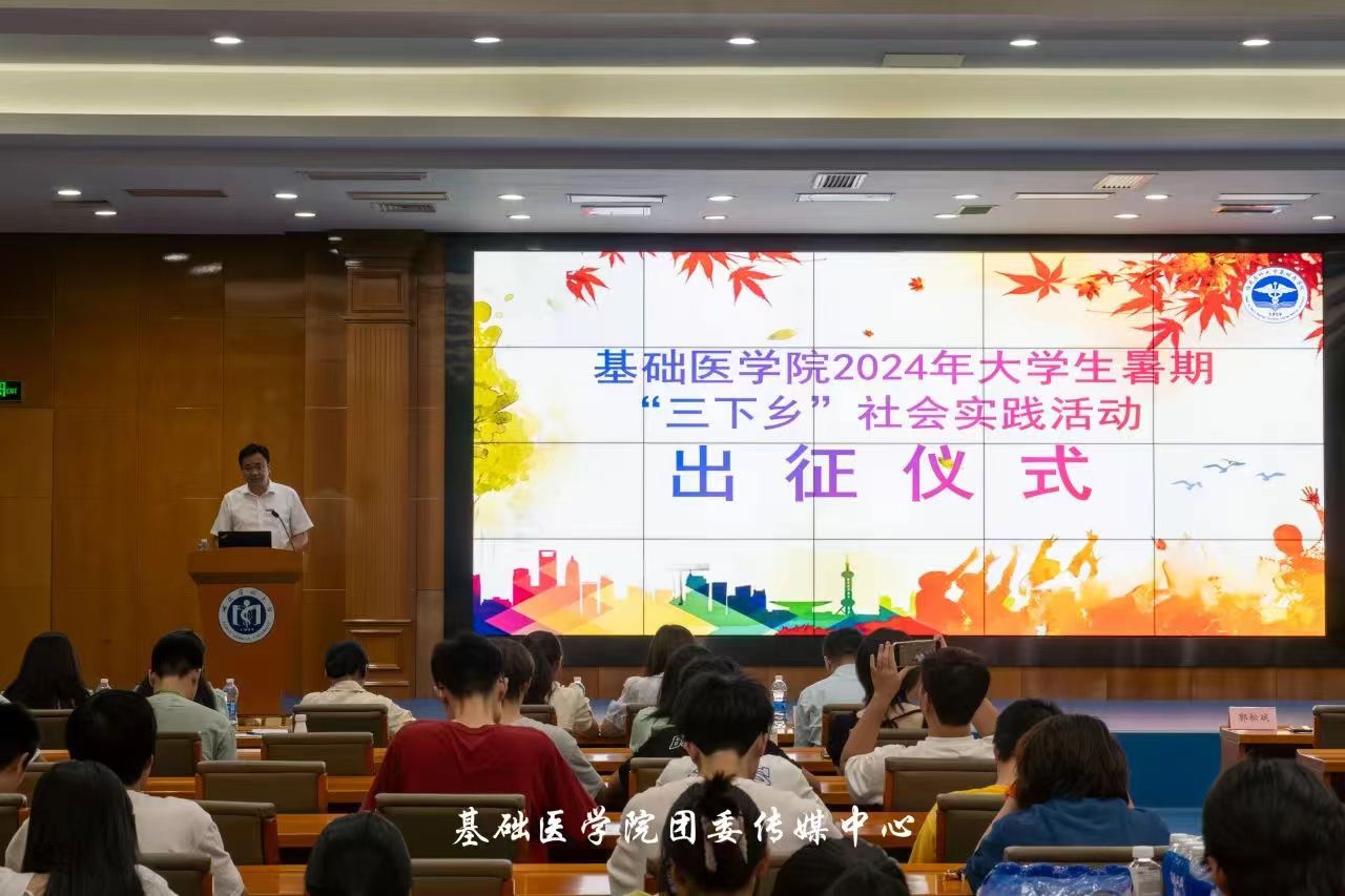 7月8日晚,自慰A片 在行政楼学术报告厅隆重举行2024年暑期“三下乡”社会实践出征仪式。学院党委书记郭松斌、党委副书记秦雷、团委书记杨翠玥,近100名实践队师生代表参加了本次出征仪式。
