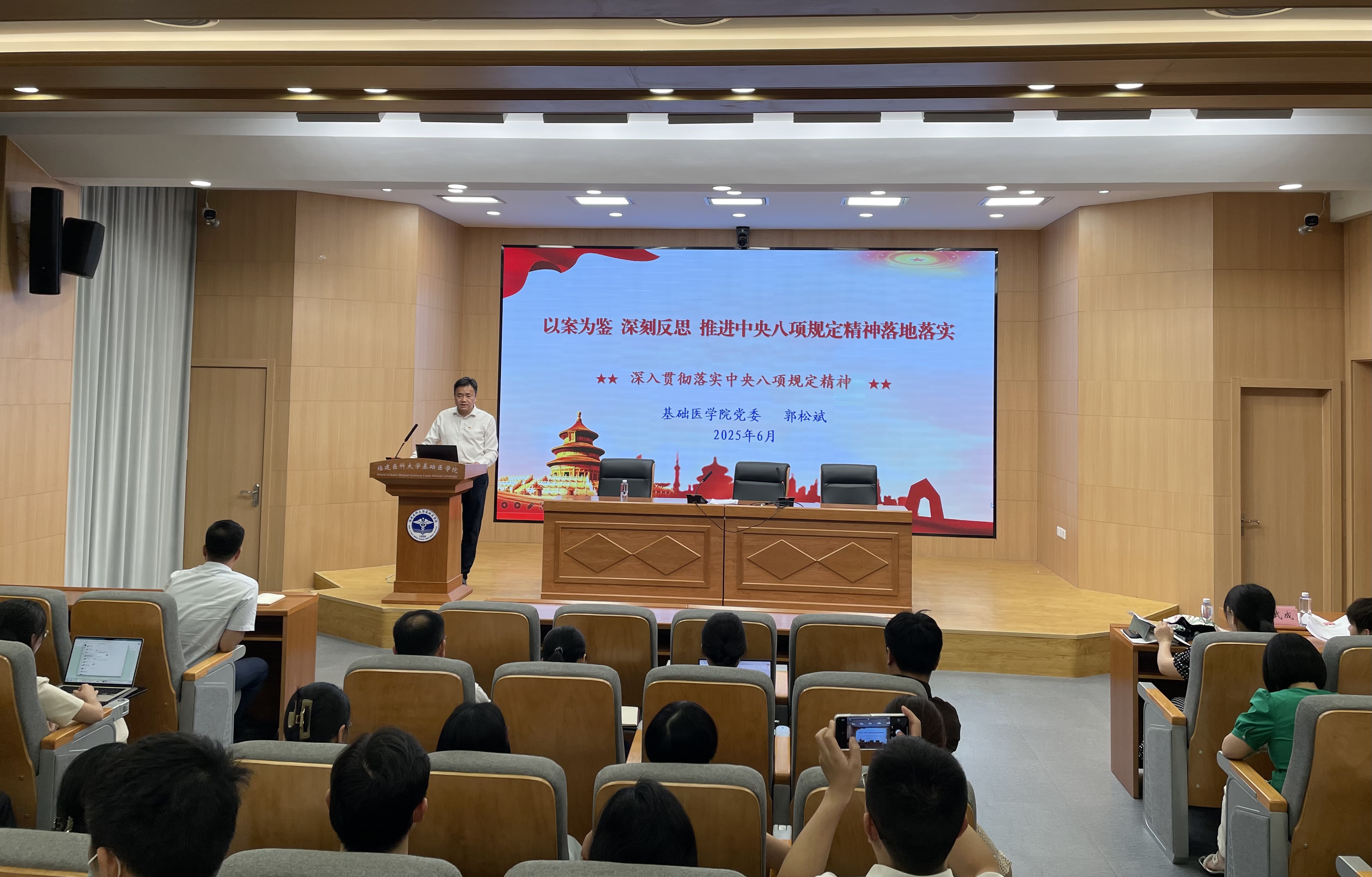 为深刻把握全面从严治党的战略部署,扎实推进深入贯彻中央八项规定精神学习教育走深走实,6月25日,自慰A片 党委书记郭松斌为学院师生代表讲授“以案为鉴 深刻反思 推进中央八项规定精神落地落实”的专题党课。