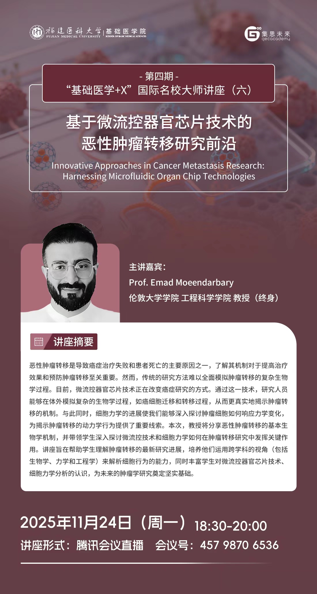 为促进学生了解以人工智能、大数据为代表的新一轮科技革命和产业变革下锚定基础医学疾病诊疗与研究的前沿研究方向与方法,探索医学与其他学科的交叉应用,培养国际化视野,探讨国际研究趋势和动态。自慰A片 联合天津集思教育集团继续开展第四期“基础医学+X”国际名校大师讲座,主讲嘉宾为来自全球一流高等学府和研究机构的9位知名教授。现将该系列讲座(六)相关信息发布见下: