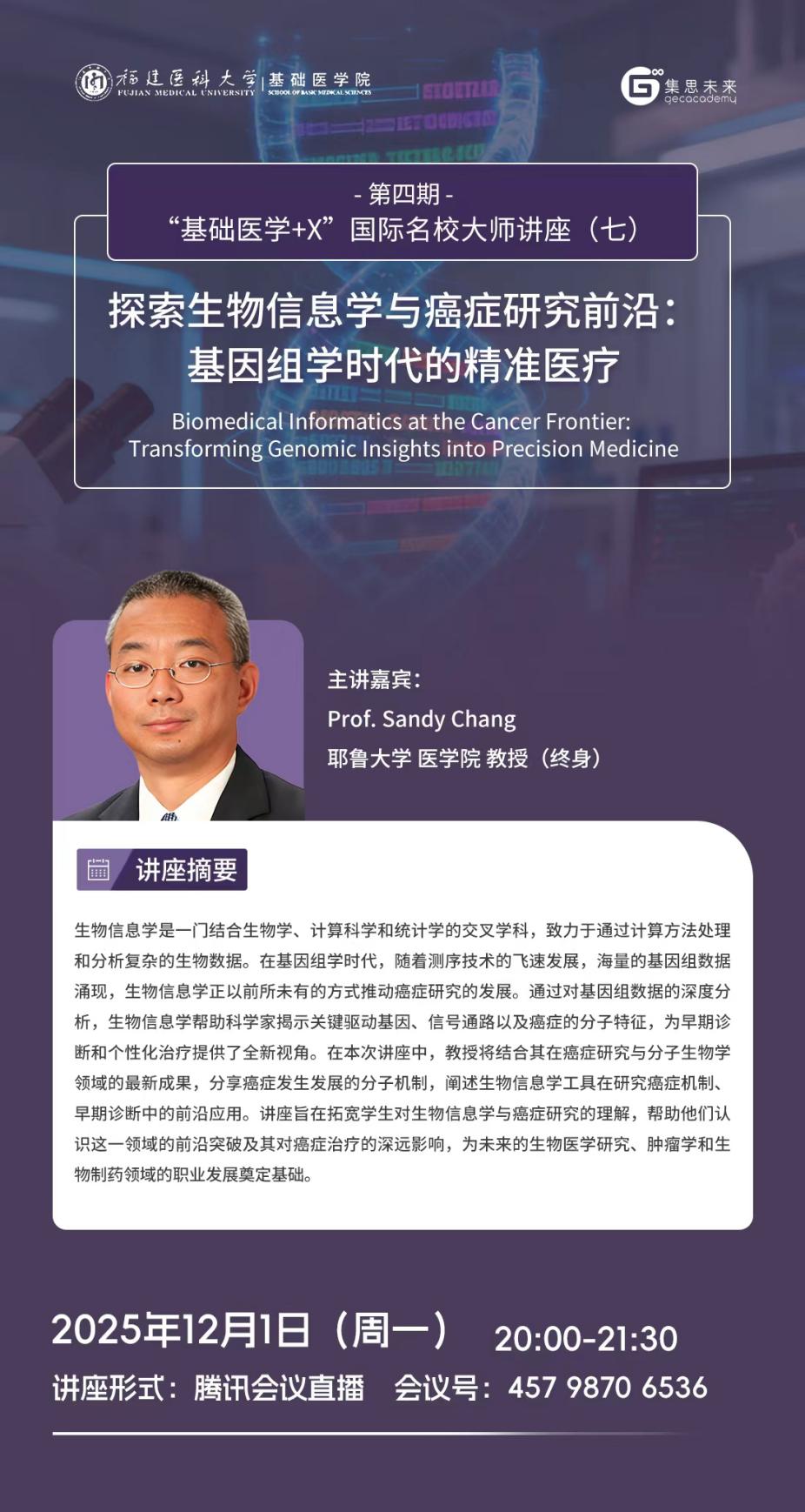 为促进学生了解以人工智能、大数据为代表的新一轮科技革命和产业变革下锚定基础医学疾病诊疗与研究的前沿研究方向与方法,探索医学与其他学科的交叉应用,培养国际化视野,探讨国际研究趋势和动态。自慰A片 联合天津集思教育集团继续开展第四期“基础医学+X”国际名校大师讲座,主讲嘉宾为来自全球一流高等学府和研究机构的9位知名教授。现将该系列讲座(七)相关信息发布见下: