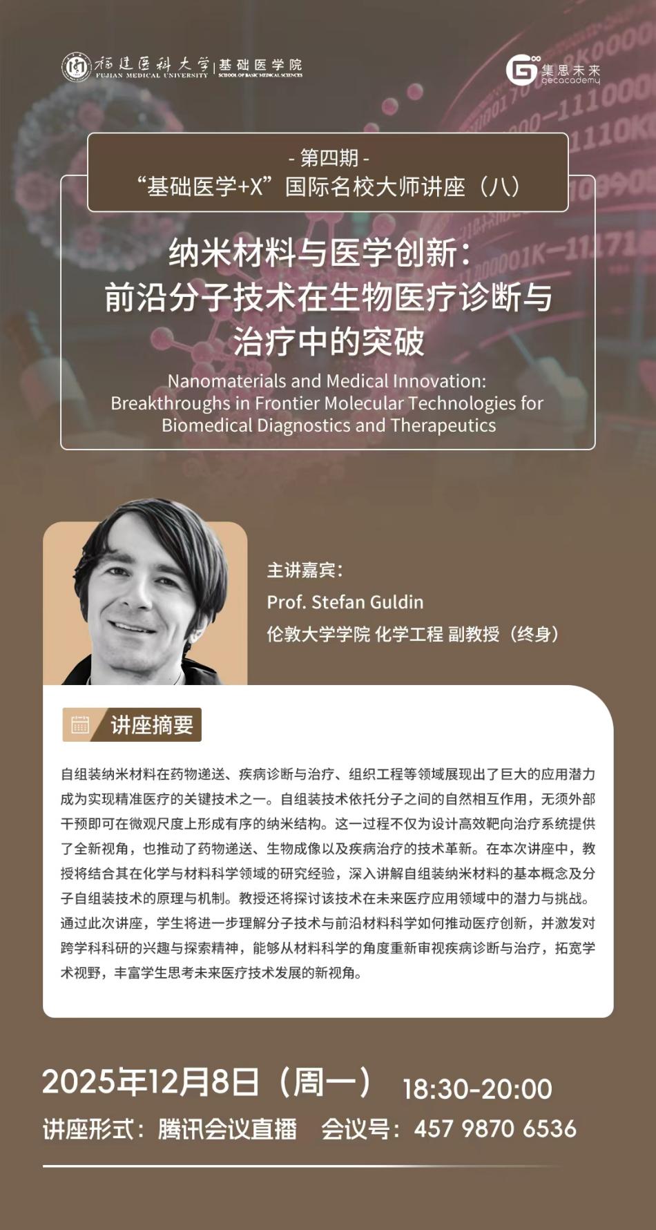 为促进学生了解以人工智能、大数据为代表的新一轮科技革命和产业变革下锚定基础医学疾病诊疗与研究的前沿研究方向与方法,探索医学与其他学科的交叉应用,培养国际化视野,探讨国际研究趋势和动态。自慰A片 联合天津集思教育集团继续开展第四期“基础医学+X”国际名校大师讲座,主讲嘉宾为来自全球一流高等学府和研究机构的9位知名教授。现将该系列讲座(八)相关信息发布见下: