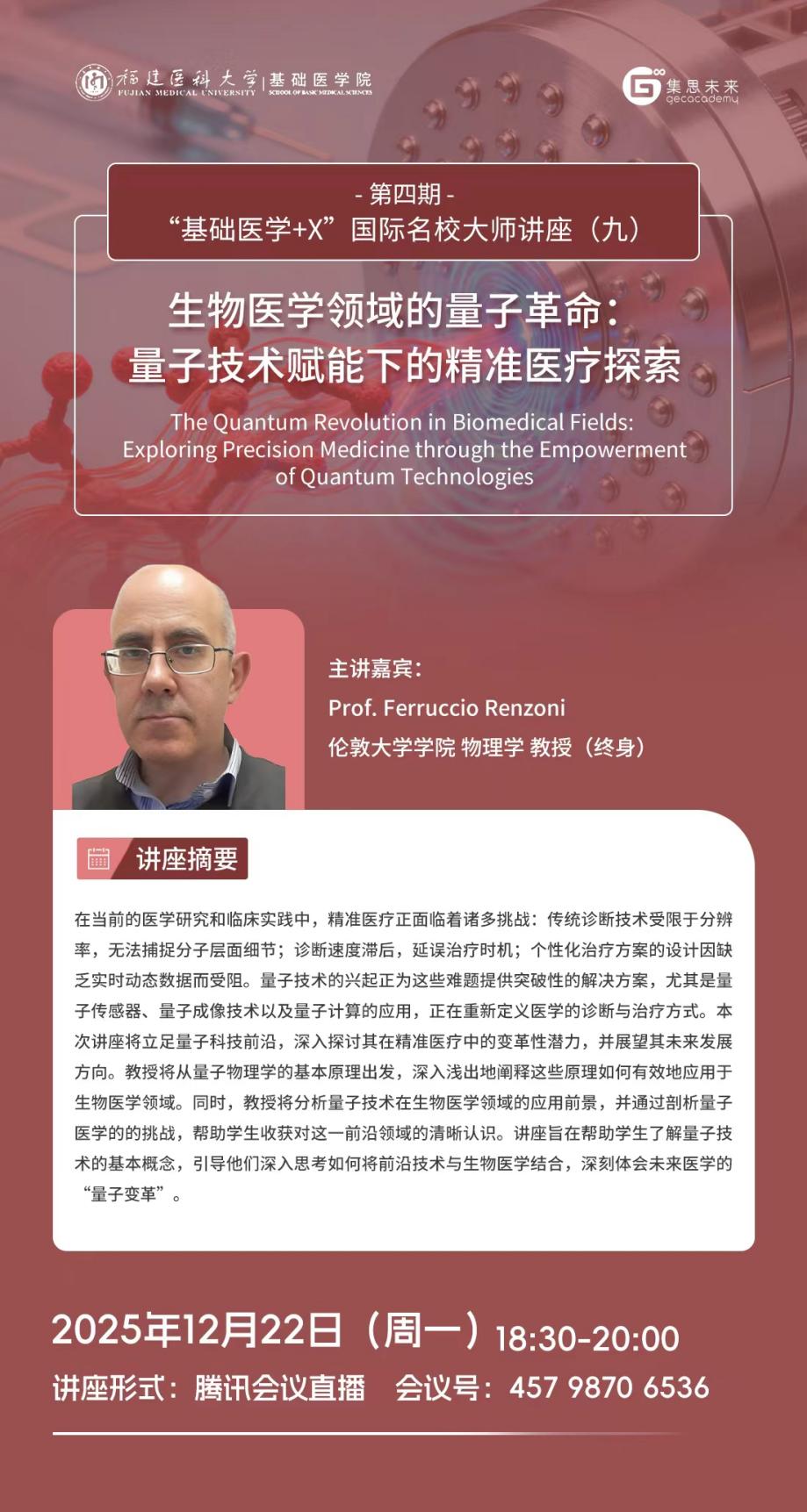 为促进学生了解以人工智能、大数据为代表的新一轮科技革命和产业变革下锚定基础医学疾病诊疗与研究的前沿研究方向与方法,探索医学与其他学科的交叉应用,培养国际化视野,探讨国际研究趋势和动态。自慰A片 联合天津集思教育集团继续开展第四期“基础医学+X”国际名校大师讲座,主讲嘉宾为来自全球一流高等学府和研究机构的9位知名教授。现将该系列讲座(九)相关信息发布见下: