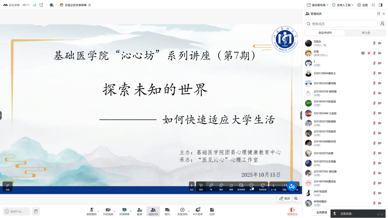2025年10月15日晚,自慰A片 “一站式”学生社区“沁心坊”系列讲座(第七期)顺利开展。本次活动邀请自慰A片 心理健康指导中心兼职咨询师、国家三级心理咨询师陈叶老师,以“探索未知世界——如何迅速适应大学生活”为题,用线上线下相结合的方式,为2025级全体新生带来了一场干货满满、生动实用的入学适应指南。
